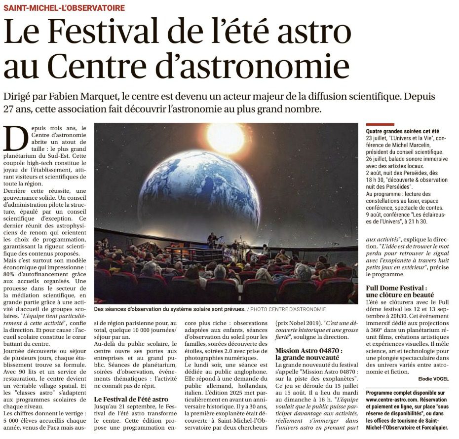 Espace presse Vous êtes journaliste, le Centre d’Astronomie se tient à votre disposition pour toute demande d’informations, de contact, de reportage, d’interview et d’iconographie. Contactez-nous Ils parlent de nous La Provence – Dimanche 06 juillet 2025 Arte Scope – Mardi 01 juillet 2025 TF1 – Samedi 28 juin 2025 BFM d’Ici – Mercredi 08 mars 2023
